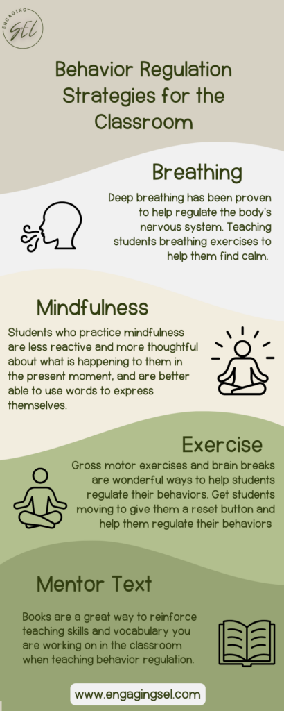 Behavior regulation is not something that will happen overnight. It takes time and practice to develop these skills. Most children in your class will likely have a good handle on this skill already, but everyone can benefit from adding these strategies to their toolbox. Next, I will share some of the strategies I use in my classroom to help students regulate their behaviors.